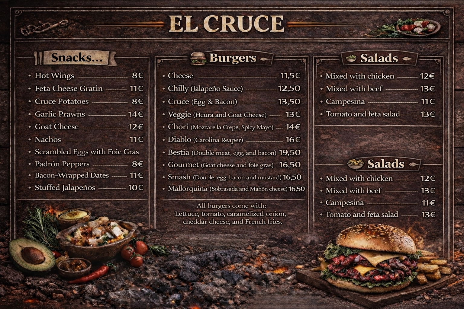 Grill culture, warm atmosphere and honest cooking. Open-fire steaks, burgers with character and terrace drinks.
